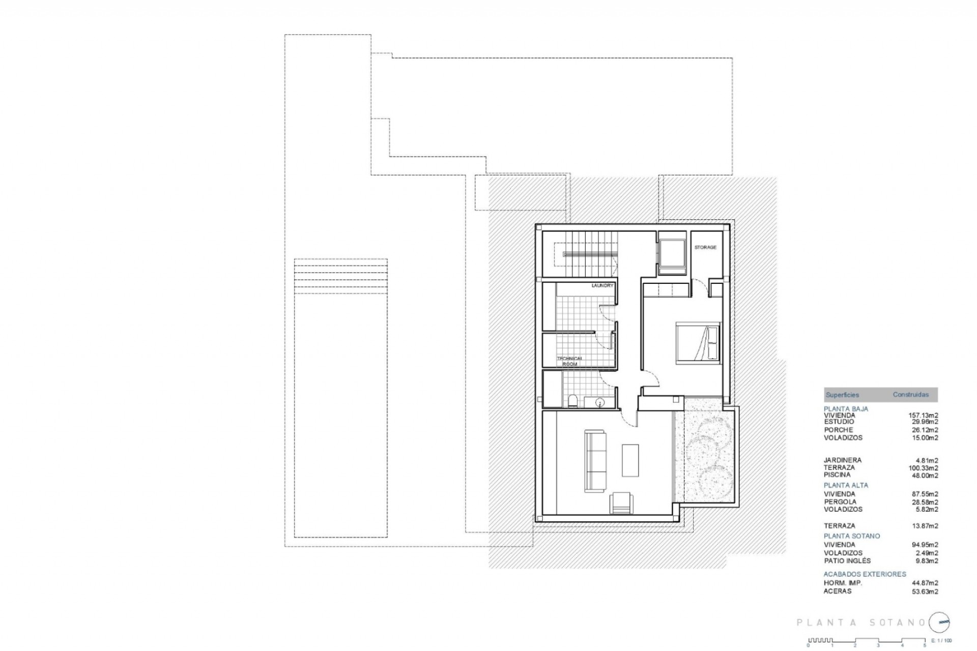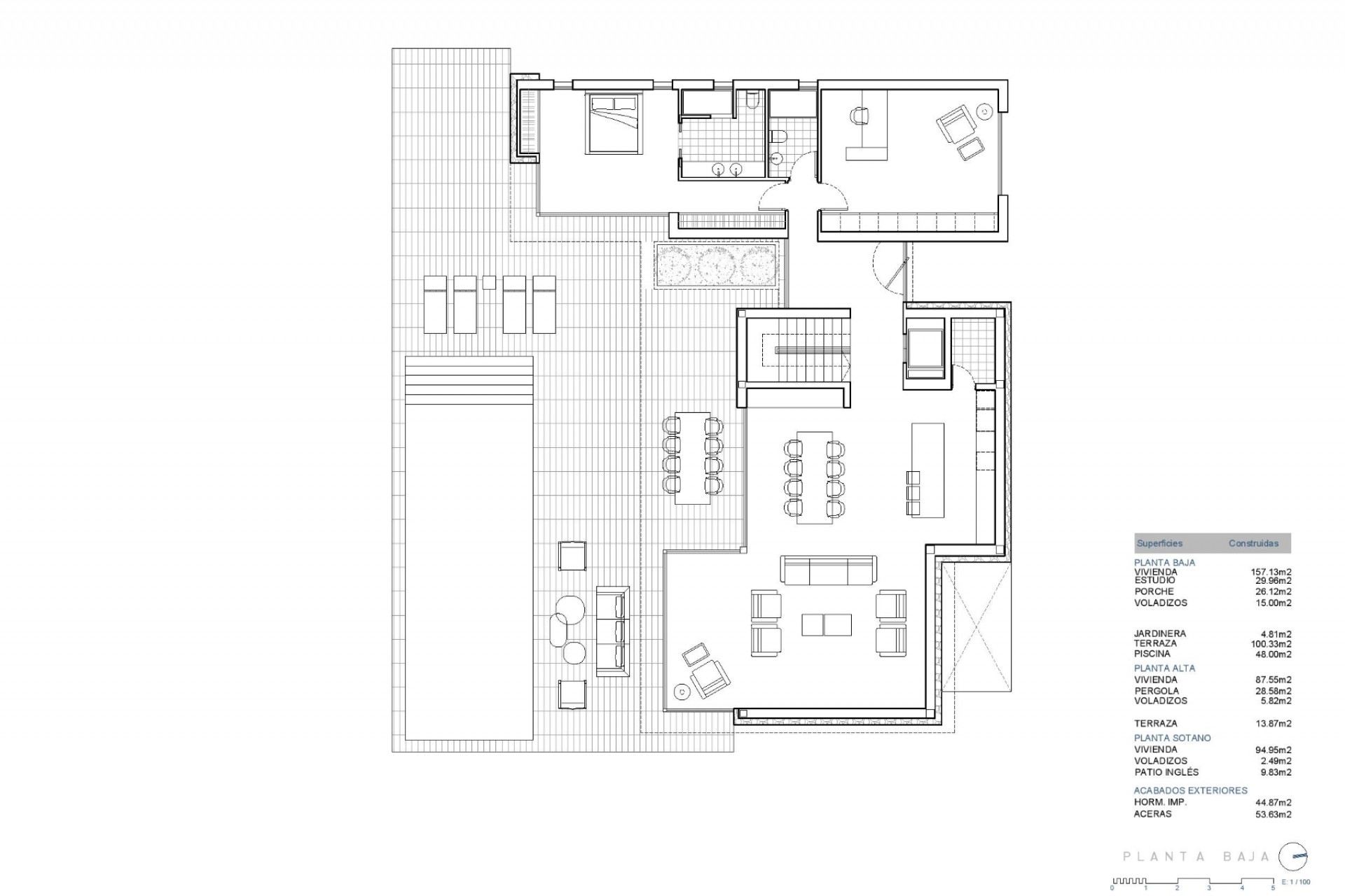 Villa moderne de deux étages avec une superficie totale construite de 395,71 m². La maison est répartie sur deux niveaux. Le rez-de-chaussée comprend une grande cuisine ouverte, un coin salon-salle à manger, une buanderie et une chambre. L'étage supérieur comporte plusieurs chambres spacieuses avec des placards intégrés et un accès à un balcon avec vue panoramique. Les caractéristiques extérieures incluent une piscine avec douche extérieure, des terrasses (couverte et non couverte) et un balcon attenant à la chambre principale. La propriété est équipée de la climatisation et de contrôle climatique. Emplacement calme, idéal pour une résidence à l'année ou un usage en vacances.