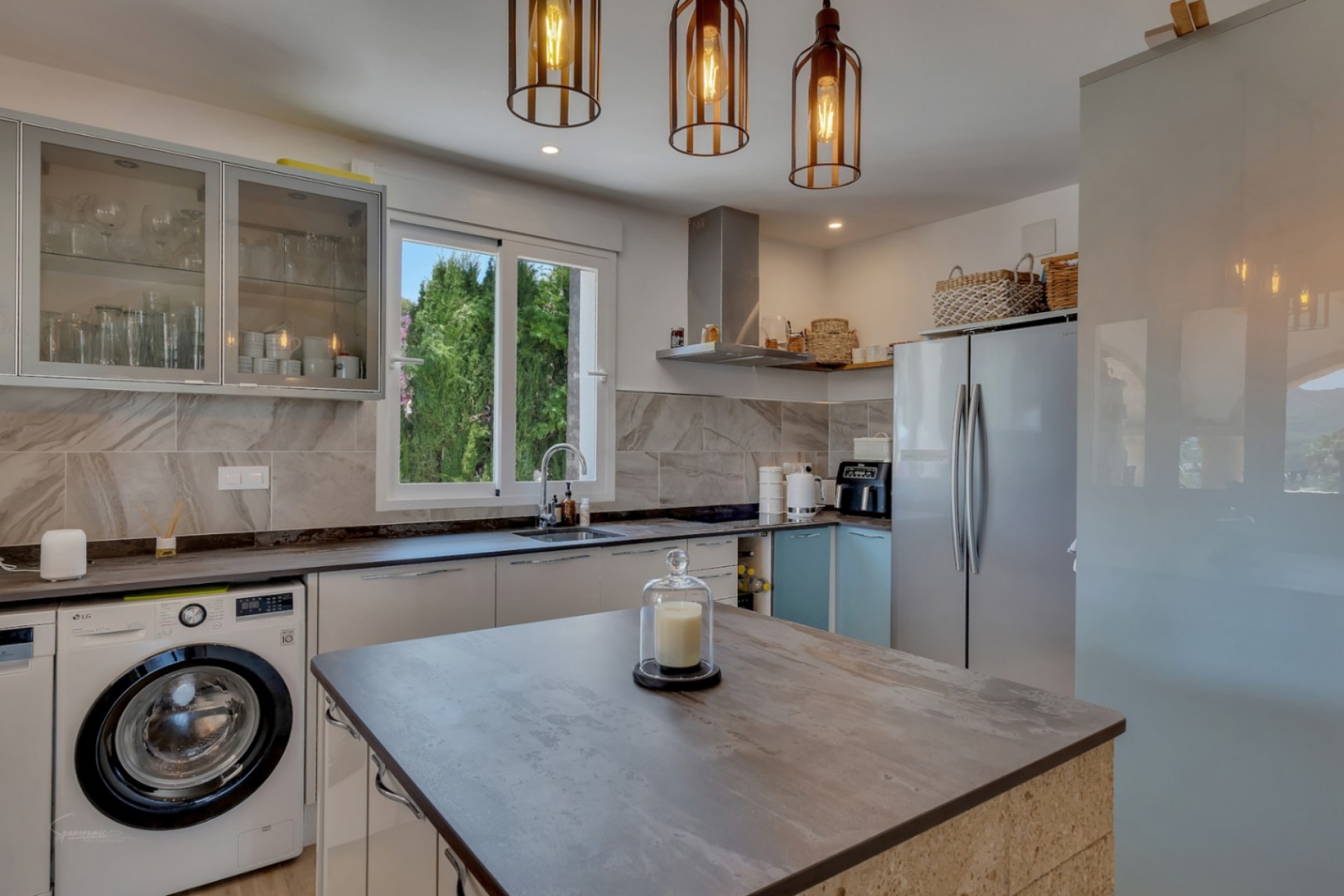 Elegante villa volledig gerenoveerd met adembenemend uitzicht in Rafalet, Jávea Ontdek deze charmante villa gelegen in het rustige gebied van Rafalet, Jávea, die in de afgelopen drie jaar volledig is gerenoveerd. Het combineert de stevige traditionele bouw met moderne verbeteringen en biedt een comfortabele en veelzijdige ruimte, perfect voor gezinnen, gasten of als vakantiewoning. Gelegen op een groot perceel van 733 m², beschikt de villa over 299 m² woonruimte verdeeld over twee onafhankelijke niveaus, die privacy en flexibiliteit bieden. Vanaf de straat heeft u toegang via grote poorten naar een geplaveide oprit, prachtig omgeven door palmbomen. Er is voldoende ruimte om meer dan twee auto's te parkeren. Achter het huis is er een kleine opslagruimte ideaal voor tuingereedschap en andere hulpmiddelen. Verdieping bereikbaar vanaf het zwembadterras door zeven treden te beklimmen, biedt een lichte en comfortabele ruimte. Bij binnenkomst in de naya wordt u verwelkomd door een open woonkamer die verbonden is met een volledig uitgeruste keuken met een eiland, gescheiden door een elegante boog van tufsteen. Bovendien zorgt de open haard in de woonkamer voor warmte en een gezellige sfeer op koele avonden. Op deze verdieping bevinden zich twee ruime slaapkamers met en-suite badkamers, evenals een multifunctioneel kantoor, ideaal om vanuit huis te werken of voor creatieve activiteiten. De overdekte naya van 40 m² is een ideale plek om te genieten van het panoramische uitzicht over de vallei en de bergen. Dit ruime terras heeft een grote tafel voor het ontvangen van familie en vrienden, perfect voor buitendiners, vieringen of onvergetelijke ontbijten. De comfortabele banken nodigen uit om te ontspannen en van het uitzicht te genieten, waardoor deze ruimte een perfecte toevluchtsoord voor vrije tijd en samenzijn wordt. Onderste verdieping - met hoofdtoegang vanuit de oprit. Op deze verdieping biedt een volledig onafhankelijke woning met eigen ingang een ruime open ruimte van woonkamer-eetkamer-keuken, drie slaapkamers (twee met en-suite badkamers), een extra toilet en toegang tot een privéterras, ideaal om in alle rust van de mediterrane zon te genieten. Opvallend is een prachtige muur van natuursteen die een warme en uitnodigende sfeer biedt, een weerspiegeling van de uitstekende combinatie van natuurlijke en hoogwaardige materialen die zijn gebruikt bij de renovatie van de villa. Buiten creëren de onderhoudsarme tuin en het betegelde zwembadgebied een serene sfeer. Naast het zwembad nodigt een charmant huisje met een bar en geïntegreerde mediterrane stijlzitplekken uit tot onvergetelijke buitenbijeenkomsten. De villa is voorzien van airconditioning in het hele huis, dubbel glas met insectenwering en rolluiken, high-speed glasvezelinternet en een alarmsysteem voor comfort en veiligheid. Op het zuidwesten gericht, geniet de woning van overvloedig natuurlijk licht en spectaculaire zonsondergangen elke dag. Gelegen op slechts 4,5 km van het oude centrum van Jávea, met zijn bars, markten en lokale charme, biedt deze goed gebouwde woning een uitzonderlijke mediterrane levensstijl in een rustige en gemakkelijke omgeving. Jaarlijkse kosten: Afvalinzameling: 146 €IBI: 1.023 €Afstand tot bezienswaardigheden: Strand van Arenal, 7 km (10 minuten met de auto)Masena Restaurant, 1,9 km (3 minuten met de auto)Lulu Beach Club: 1,6 km (3 minuten met de auto)Golfclub Jávea: ongeveer 2,9 km (4 minuten met de auto)Internationale School XIC: 5 minuten met de autoLuchthaven Alicante: ongeveer 100 km (1 uur en 15 minuten met de auto)Luchthaven Valencia: ongeveer 120 km (1 uur en 30 minuten met de auto)