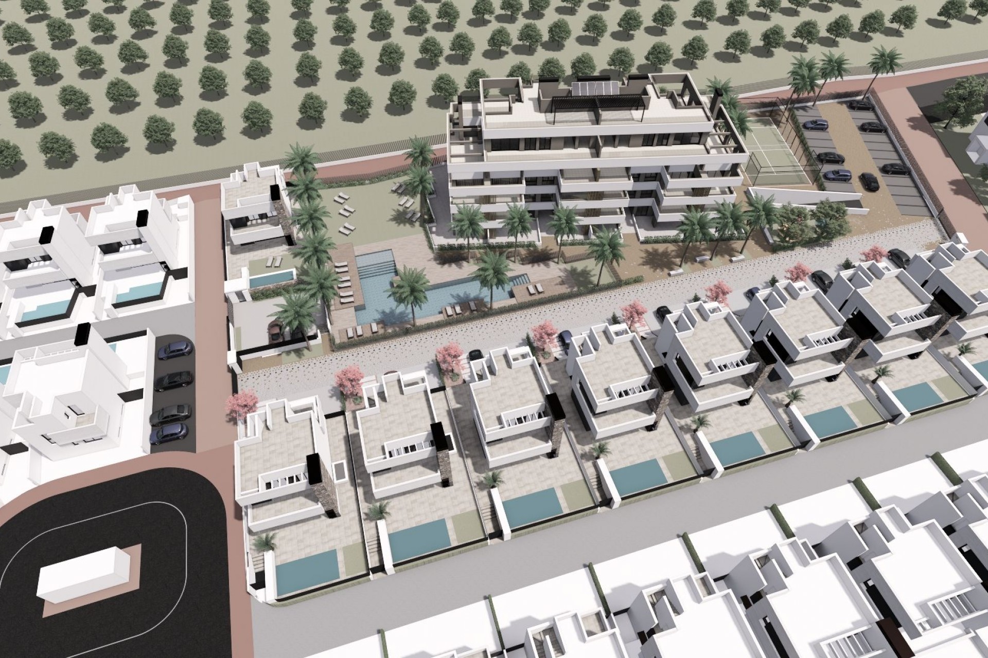 Het exterieurontwerp van het complex weerspiegelt een combinatie van eigentijdse lijnen en hoogwaardige materialen, waardoor een moderne esthetiek ontstaat die naadloos aansluit op de natuurlijke omgeving. De architectuur van de gebouwen is ontworpen om te profiteren van natuurlijk licht en biedt vrij uitzicht op het omringende groen en landschap. Verdeling van de woningen: Appartementen met 2 en 3 slaapkamers en 2 volledige badkamers. Begane grond opties met eigen tuin, middelste verdiepingen met grote terrassen en penthouses met eigen solarium. Parkeerplaats en berging inbegrepen voor extra gemak. Grote ramen die het natuurlijke licht maximaliseren en een panoramisch uitzicht bieden. Optimale oriëntatie om het hele jaar door te profiteren van zonlicht. Het complex is omgeven door aangelegde tuinen met inheemse vegetatie en decoratieve elementen die een sfeer van rust en verfijning creëren.