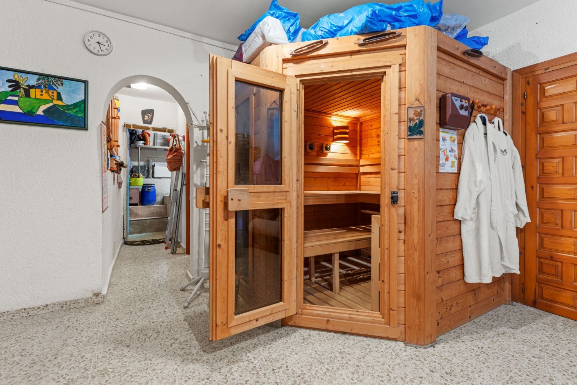 Daarnaast is er een veelzijdige ruimte die momenteel dienstdoet als sauna en opslag, maar die met minimale aanpassingen kan worden getransformeerd tot een gastenverblijf (ramen en deuren reeds aanwezig). Deze ruimte heeft directe toegang tot een ruim terras, omgeven door groen en met veel privacy.
