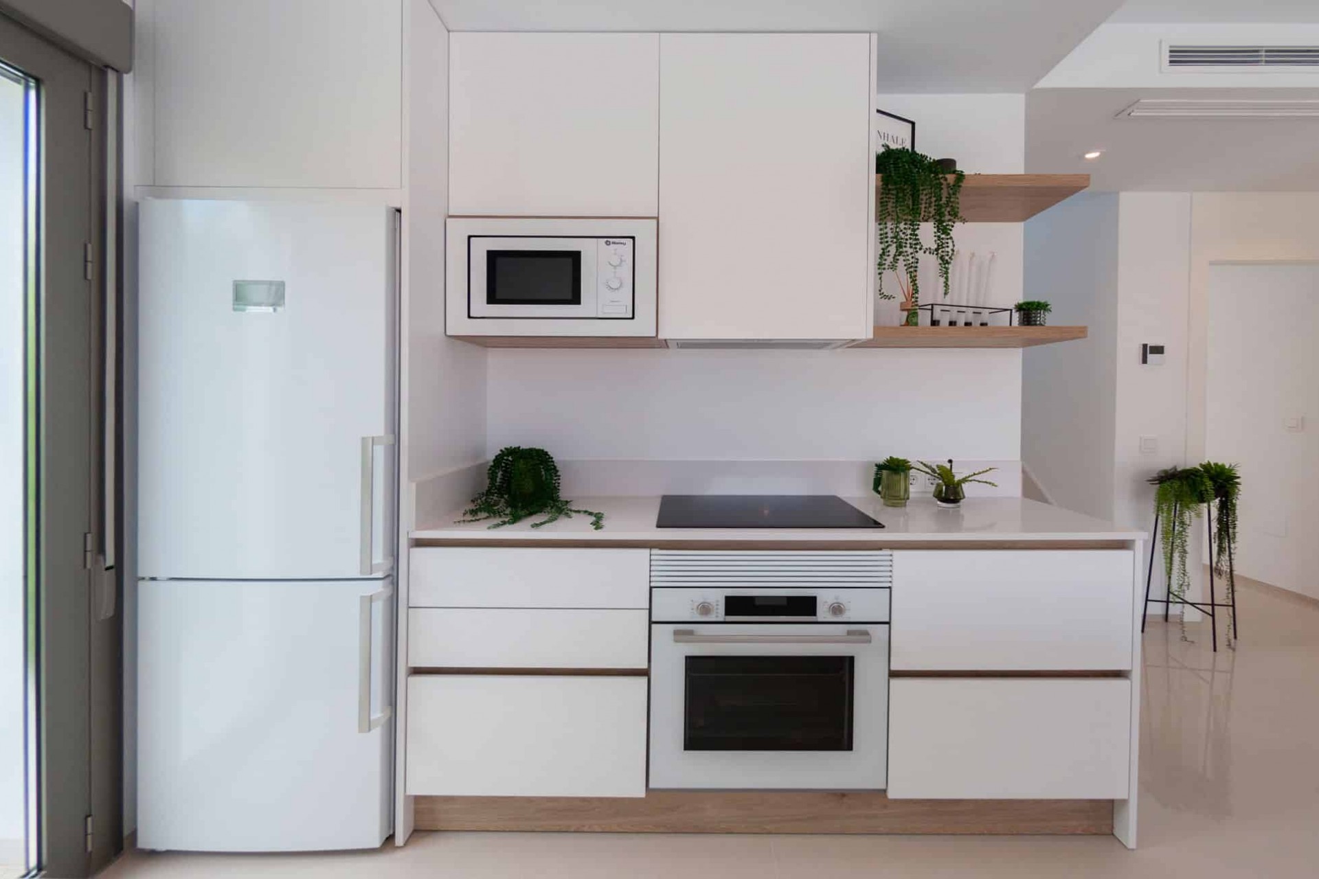 The interior of the villa is designed to offer a modern and comfortable space. With a constructed area of 126 m² and 105 m² of living space, the villa has 3 double bedrooms and 3 complete bathrooms, all of them with high quality finishes. The open-plan kitchen, equipped with modern appliances, integrates perfectly with the spacious living-dining room, creating an open and welcoming atmosphere. The large windows let in plenty of natural light, enhancing the feeling of spaciousness and connection with the exterior. Built-in wardrobes in the bedrooms offer ample storage space. The interior design, with its focus on functionality and style, ensures that every detail contributes to a welcoming and stylish ambience.