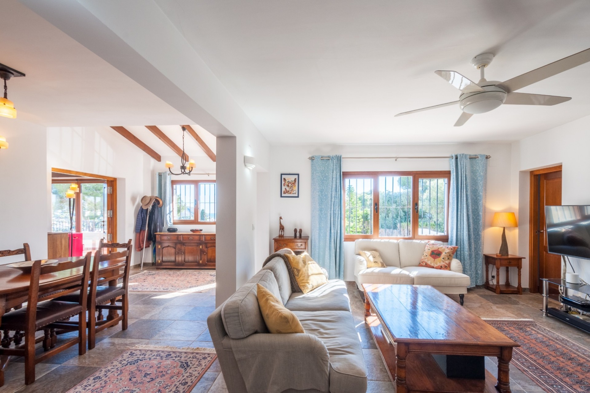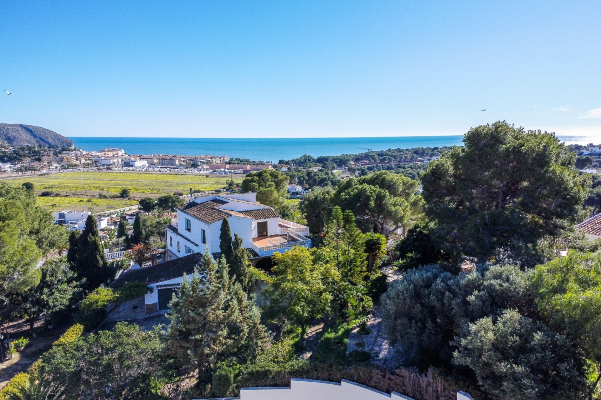 Villa in Moraira built in 2015, southeastfacing with sea views. Located 1,250 metres from the town centre and 1,100 metres from the beach, both reachable on foot. Distributed over two floors. The property offers a living room, separate dining room, kitchen, laundry room, four bedrooms and three toilets, two of them ensuite. Equipped with double glazing, fireplace and air conditioning in the bedrooms. Outdoor features include terraces (partly covered), private garden, private swimming pool, outdoor shower and an additional bathroom next to the pool. Wintergarden with exterior kitchen, fully openable. External stairs. Garage for one car with spacious storage room, exterior parking for two cars, automatic entrance gate. Good privacy.