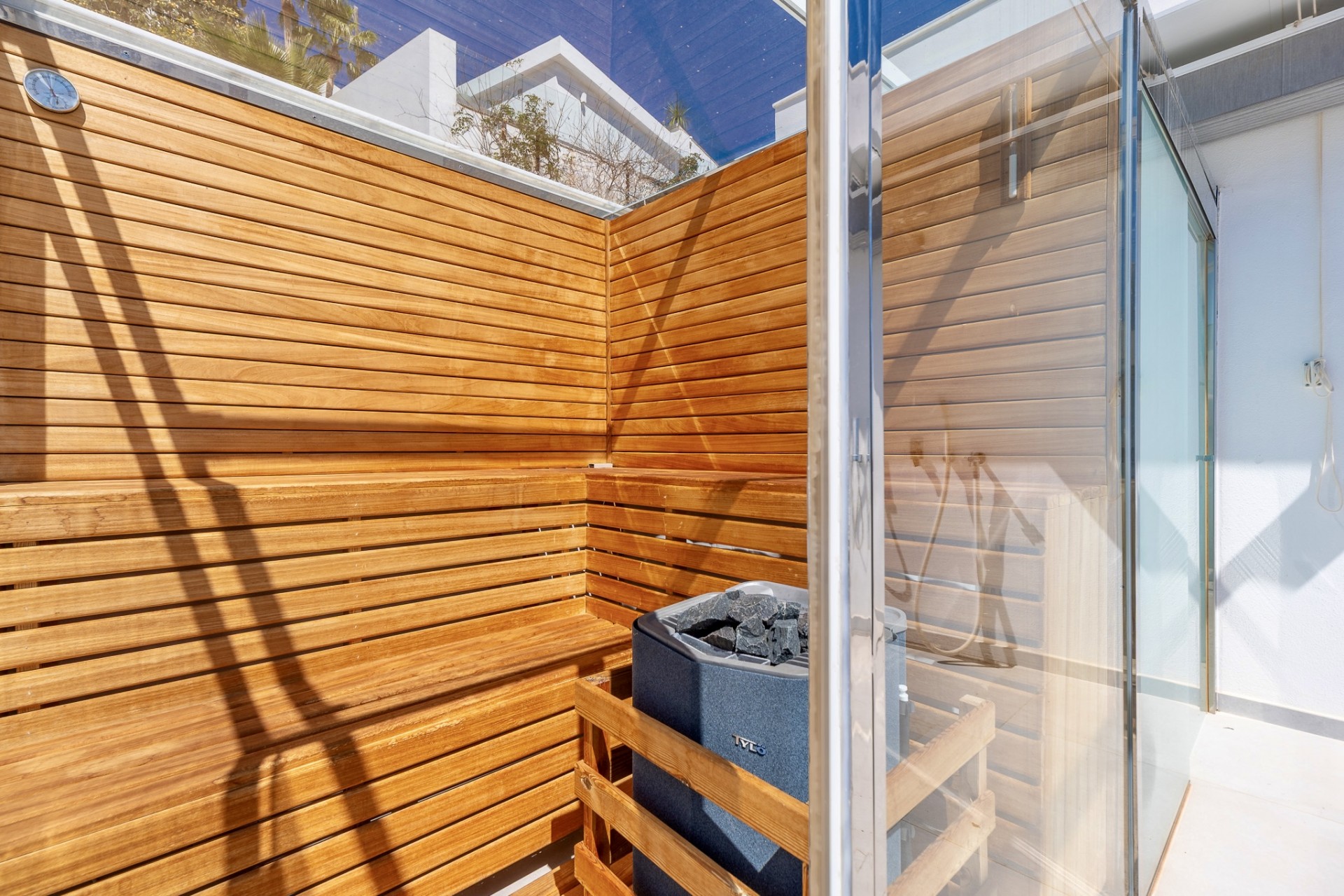 This villa in Moraira, built in 2023 and southeastfacing, offers panoramic sea views. The property is located 3.5 km from the town center and the beach. It has 4 bedrooms, all with ensuite bathrooms, and a guest toilet. The house is spread over three floors with an elevator and includes a living room, dining room, and kitchen, as well as an outdoor kitchen. There is a heated infinity pool of 38 m², a garden, a garage for two cars, and additional exterior parking. The villa features underfloor heating, air conditioning, double glazing, an alarm system, and automatic gates. Energy efficiency rating is B.